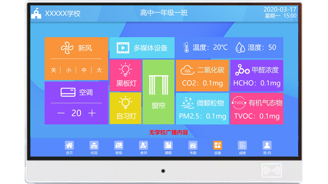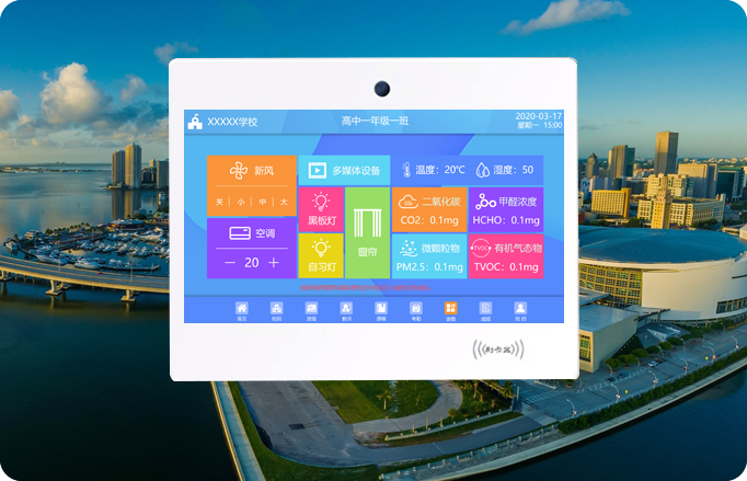 以及二氧化碳、甲醛濃度等教室設(shè)備環(huán)境進(jìn)行一鍵控制,上課、自習(xí)、午休等多種場(chǎng)景模式,