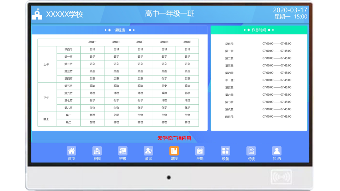 對(duì)所在班級(jí)的課程安排以及學(xué)校的作息時(shí)間的展示,讓師生合理安排時(shí)間,增強(qiáng)時(shí)間觀念。